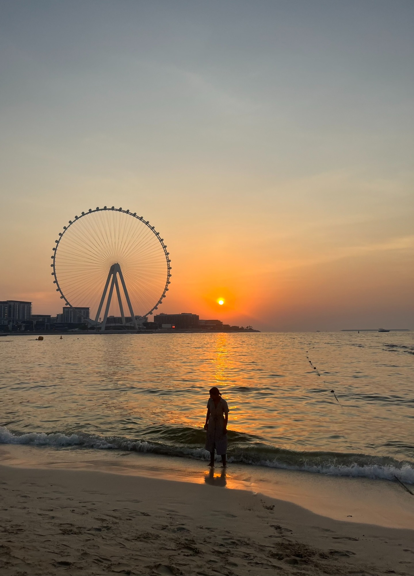 Aparcamos en uno de los parkings de los hoteles y vimos el atardecer desde la playa, con vistas a la famosa noria Ain Dubai.